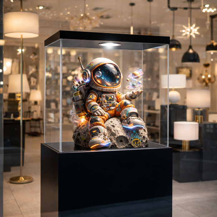 Alles aus dem Basis-Set — plus einem massgeschneiderten Aufsatz mit kaltem LED-Spot. Das fokussierte Licht taucht jede Resin-Figur in ein sauberes, klares Spotlight und hebt feinste Lackdetails und Strukturen hervor. Der Aufsatz wird individuell für deinen Kasten gefertigt und per USB-C betrieben.